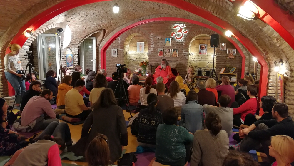 Es ist der dritte Besuch von Vishwaguruji in Georgien und nach eineinhalb Jahren gab er wieder ein Wochenendseminar in Tiflis. Es startete mit einem öffentlichen Vortrag in der gemütlichen "Yoga Höhle" welche bis zur letzten Ecke gefüllt war. Mehr als 100 Interessierte, viele von Yogakursen, aber auch viele neue sind zusammengekommen, um Vishwagurujis Vortrag "Wie erlangt man Glückseligkeit durch Yoga" zu hören.